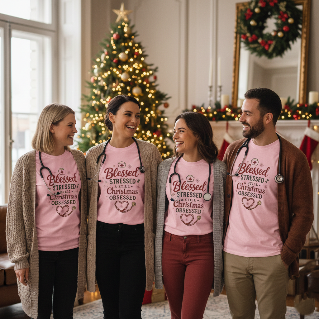 Wear it between shifts, layered under a cardigan at family dinners, or paired with jeans for late-night holiday errands. It turns holiday chaos into something tender and bright.