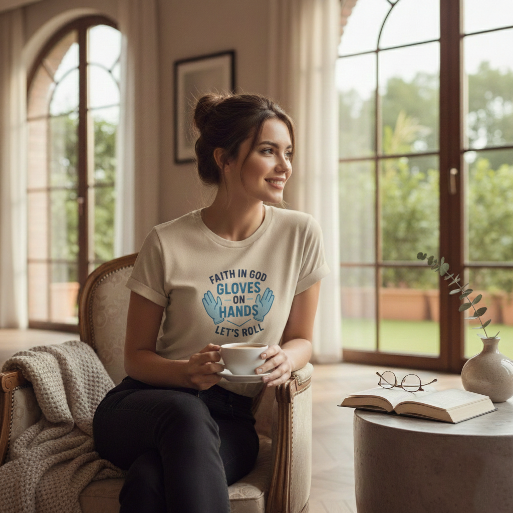 This tee carries your motto: Faith in God, Gloves on Hands — Let's Roll.