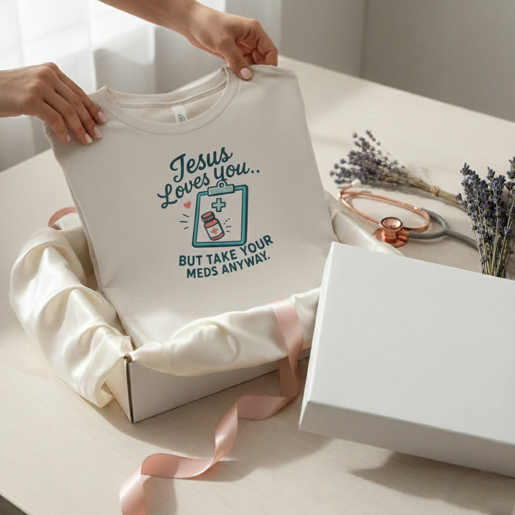 • 💊 "Jesus Loves You... But Take Your Meds Anyway" design – funny, honest, mental health-positive